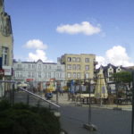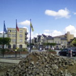 Plac rynku jest wolny od zabudowy. Jest bruk, ułożony wachlarzowo, granitowy chyba. Drewniane pergole, ławki, donice na trawy, podesty do siedzenia i niskie drzewka. Jeszcze pnącza z dużymi liśćmi: zieleń, która obrośnie pergole, grafitowe metalowe maszty flag, niskie, i nowoczesne latarnie z drewnianą okładziną i wzorem jak z haftu kaszubskiego. Nie na środku fontanna z podłogi, czyli dysze pionowo wypuszczające wodę, która potem ginie w szczelinach ciemnych płyt. Przy tej fontannie kaszubskie nuty dla turystów na blasze, również na podłodze. Poświęcam chwilę tej „małej architekturze”, bo wiem, kto ją robił i doceniam projekt. Ładnie wychodzi. To świeża sprawa, zieleń jeszcze niska i budowa trwa.