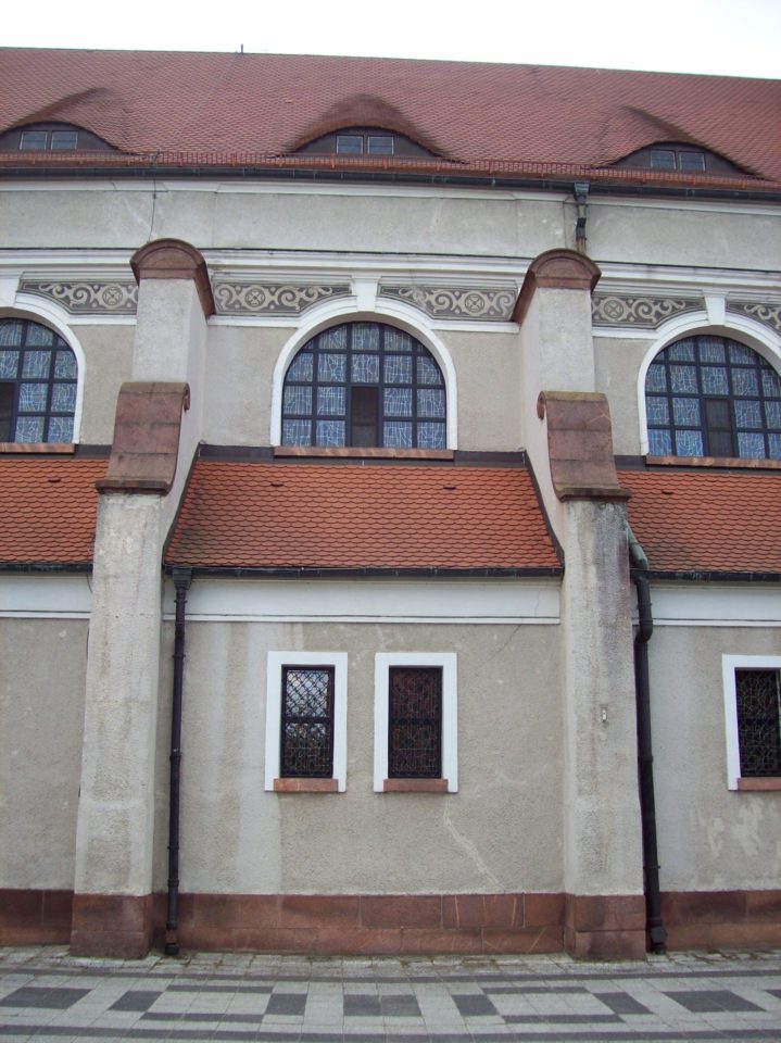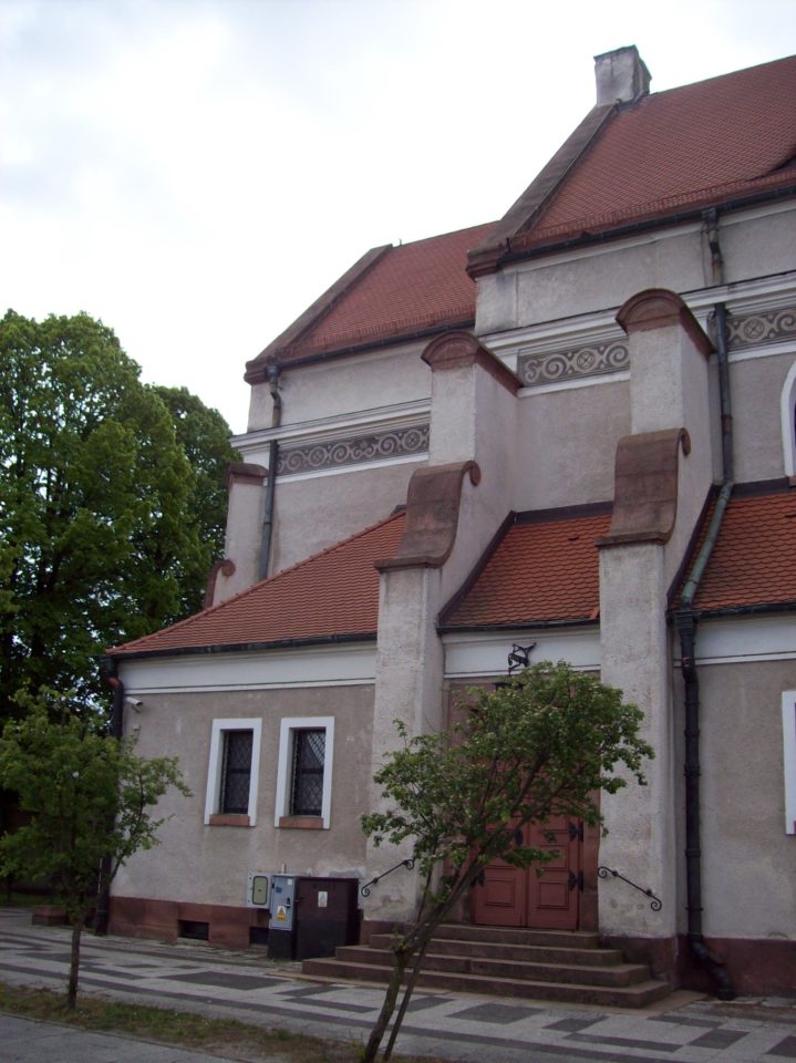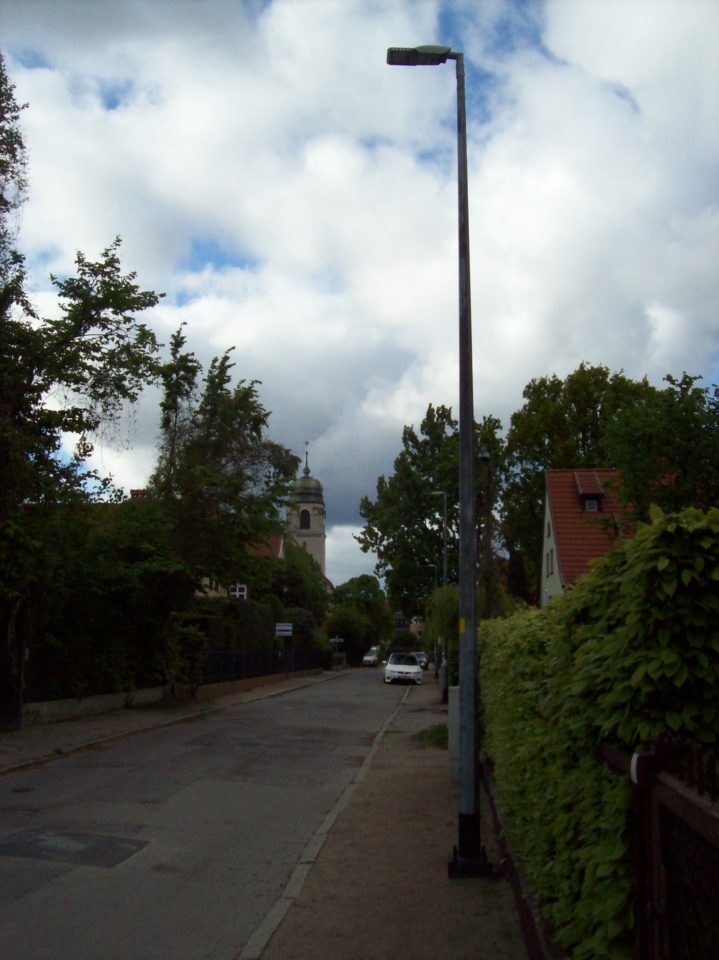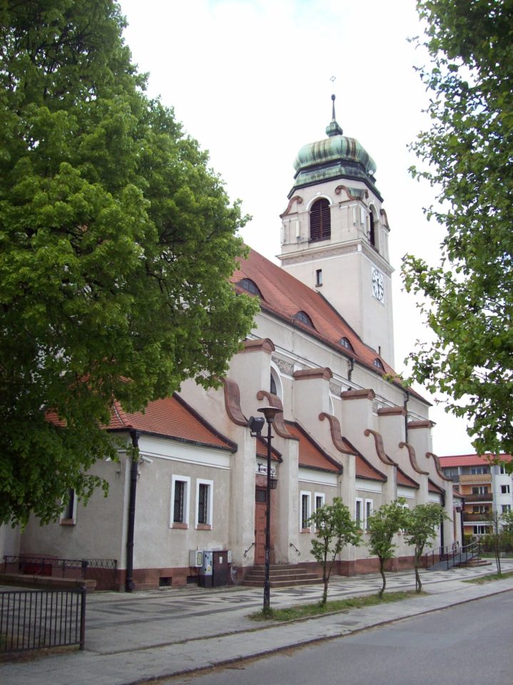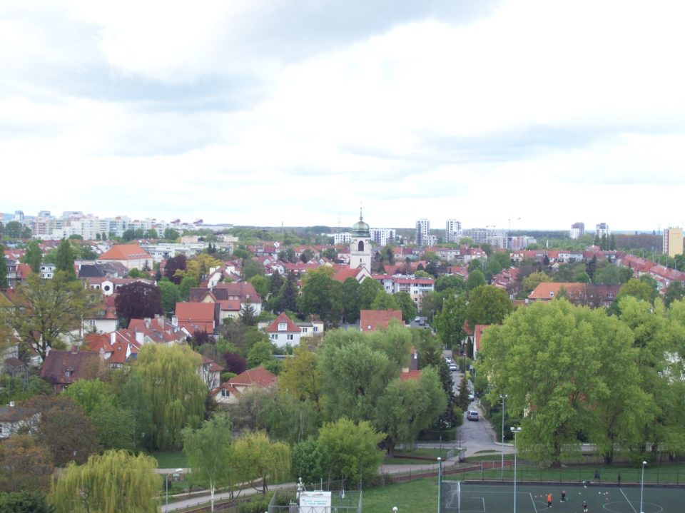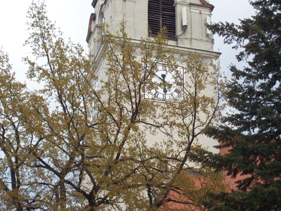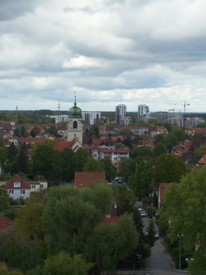 Od góry, na tle nieba białosiwego odbija się krzyż z kołem pośrodku, jak w monstrancji. Stoi na kuli, może kuli ziemskiej i wieńczy cebulasty hełm z zielonej blachy. U jego spodu granica nieba i lasu nadmorskiego. Dalej słupek wieży, w jasnym ziemistym kolorze, może jasnej gliny. Zamknięte drewnem okno z pełnym łukiem, przy łuku nad rogami wieży dwie woluty, na nich jeszcze kawałki tej zielonej blachy. Pod oknem gzyms dzielący tę część wieży mniej więcej w połowie, u dołu wbija się trójkąt szczytu dachu z małym kominem, czerwona dachówka obramowuje go. Więcej już stąd nie widać, wszystko tonie w zieleni koron drzew, czerwieni dachów i oczach okien z najwyższych pięter domów.