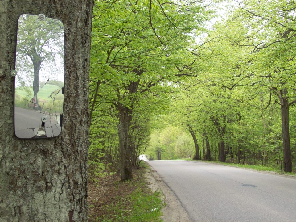 Połęczyno leży obok tej mojej wczorajszej drogi, także mój kierowca skręcił i zostawił mnie na głównej, trochę „nigdzie”. Tak by mógł ktoś pomyśleć, ale dla mnie to właśnie było „tu”, to warto zobaczyć. Droga była po obu stronach obsadzona drzewami, szpalerem, który gdzieś daleko wydawał się nawet z góry ją obejmować a potem, gdy skręciła, był też tłem, w które wjeżdżały samochody. Jest maj i wszystko się „mai”, kwitnie, wzrasta, przystraja się. Jabłonie w kwiatach, łąki w mleczach, drzewa „zwykłe” w pąkach i młodych liściach. Młode liście oglądałem zwinięte, delikatne, jasne, czekające by w swoim czasie się rozwinąć, wyprostować, wzmocnić i ściemnieć. A może nie wszystkie liście tak ciemnieją, jak bukowe. Zwracam uwagę na drzewa, ale mało jeszcze na nich się znam. Postanowiłem iść tą drogą, znaleźć jakieś dobre miejsce do zatrzymywania samochodów, chyba dlatego, że droga była trochę jak główna – samochodów wprawdzie mało, ale szybko przejeżdżały, prosta droga, no i te drzewa. Nie pamiętam, czy kompletnie nie było gdzie się zatrzymać, czy chciałem kawałek pójść. Zmieniłem stronę drogi na lewą, żeby uważać na siebie, i szedłem poboczem starając się nie skupiać na tym, czy gdzieś jeszcze dzisiaj dotrę, czy po prostu za jakiś czas zacznę wracać. Starałem się być tu i chłonąć to, co też tu jest, szukać poezji. Skręciłem na łąkę – zielone pastwisko z mleczami, bo mnie pociągnął jego widok. Pomyślałem jakiś zaczątek takiej myśli, że może droga w znaczeniu szosy, śladów kół czyichś, jest mi w ogóle niepotrzebna i mogę równie dobrze albo lepiej iść i szukać tej poezji albo iść i być na tej łące, środkiem. Ubita droga jest raczej potrzebna, żeby wrócić do domu. Trochę szybciej wrócić do domu, niż gdyby się wracało idąc środkiem, na azymut. Tylko tyle? Na drodze ubitej można też łatwiej spotkać drugiego człowieka, na przykład kierowcę, i poznać trochę jego, posłuchać jego opowieści. To też warto, ale lubię zejść z takiej drogi czasem i pójść takim pastwiskiem.