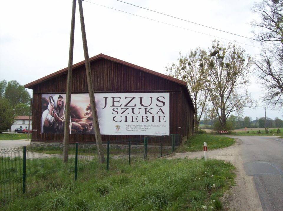 To było to skrzyżowanie za Nową Karczmą, które się raczej nie nazywa, od którego zacząłem opowiadać. Przypomniałem sobie tam Kamionkę i stary wiersz, który tam stojąc zacząłem pisać, ale nie byłem tam długo, bo wkrótce trafili się ci starsi państwo i znalazłem się w Iłownicy. Mała miejscowość, były tam zakręty, przystanki autobusowe, duży zakład skupujący zboże i dwaj chłopcy, grający w piłkę. Chwilę tam spędziłem, nawet namyślałem się nad zaczekaniem na któryś autobus, do Starogardu albo do Kościerzyny. W jedną stronę kursowały tam według rozkładu dwa autobusy dziennie – rano i po południu. Trudno się tam dostać, a ja tam byłem, byłem w Iłownicy. Przy tym dużym zakładzie zbożowym stała stodoła, na jej ścianie szczytowej zawieszono wielką płachtę z wiadomością: „JEZUS SZUKA CIEBIE” i ze słowami papieża Franciszka: „Nigdy nie jest zbyt późno, by się nawrócić, a to jest niezbędne, teraz! Zacznijmy już dzisiaj.” I na innym miejscu na tablicy wypisano również słowa papieża: „Otwórzmy nasze serce na miłosierdzie! Boże miłosierdzie jest silniejsze niż grzech!” Ktoś zadał sobie wiele trudu, żeby wypisać te słowa w takiej małej wiosce, więc postanowiłem po prostu Wam je przekazać. Myślałem, że może już nikogo nie złapię, wsiądę do autobusu i wrócę do domu po przesiadce na pociąg, ale to jeszcze nie był koniec.