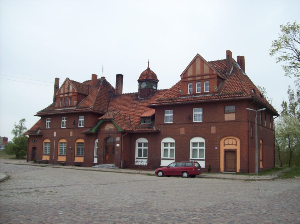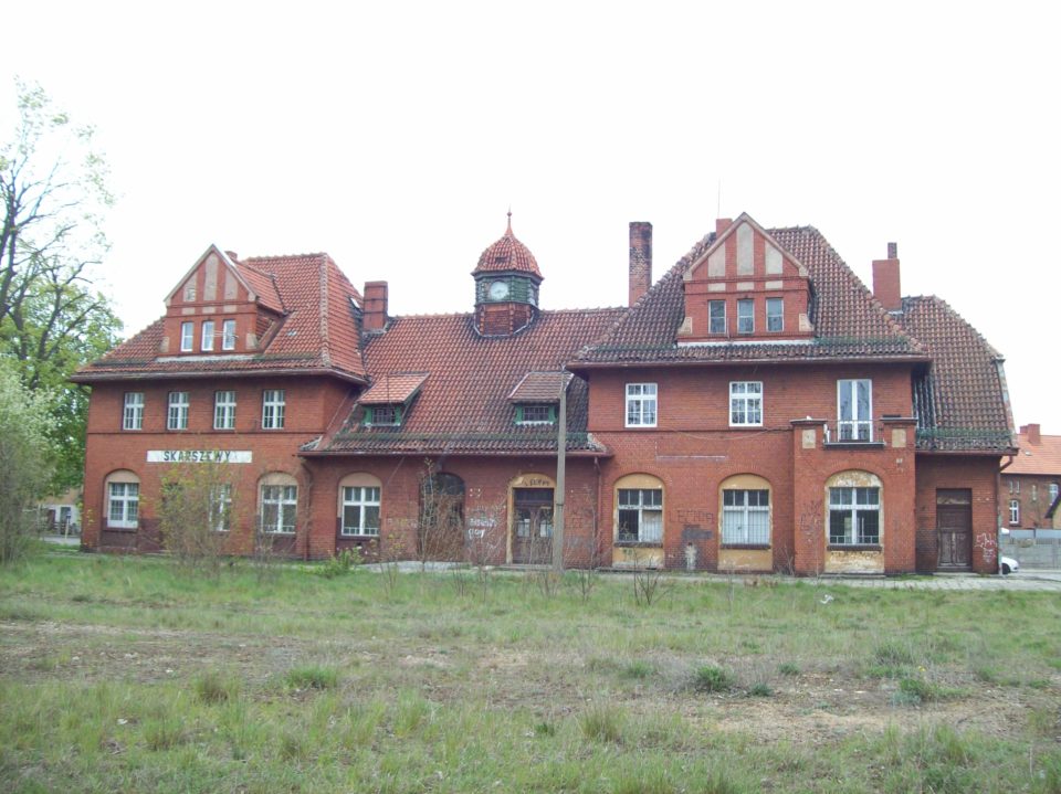 Dworzec był z czerwonej cegły, spory, z ładną czerwoną dachówką i ośmioboczną wieżyczką, na której nie ma już zegarów. Na tej wieżyczce coś, co bardzo lubię, czyli dachówka zawieszona pionowo na ścianach. Wewnątrz częściowo zamieszkany, częściowo zapuszczony, a w środkowej części miał być otwarty „klub” dla seniorów, ale chociaż godzina się zgadzała, był zamknięty. Przed dworcem plac brukowany, z którego odjeżdżają autobusy i busy, sprawdziłem sobie transport do Tczewa, równo za godzinę. Za dworcem łąka, która musiała kiedyś być torowiskiem. Poszedłem poznawać Skarszewy, świadomy, że muszę robić to niestety szybko.